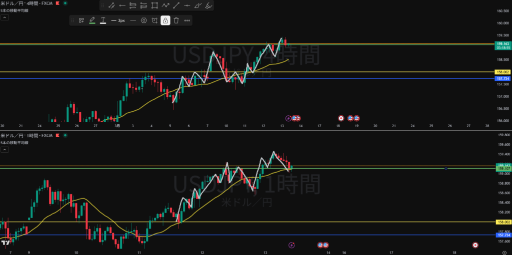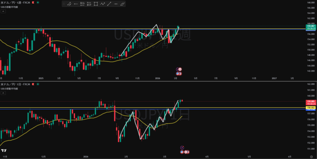 方向上 トレンド継続 週足高値も同時越え 上昇の波の途中 黄色線下に押し目買い勢力