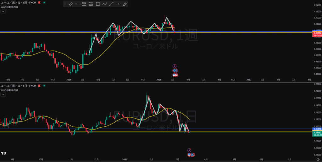 方向下 黄色線を明確に抜けたと定義すればトレンド継続 下落の波の途中