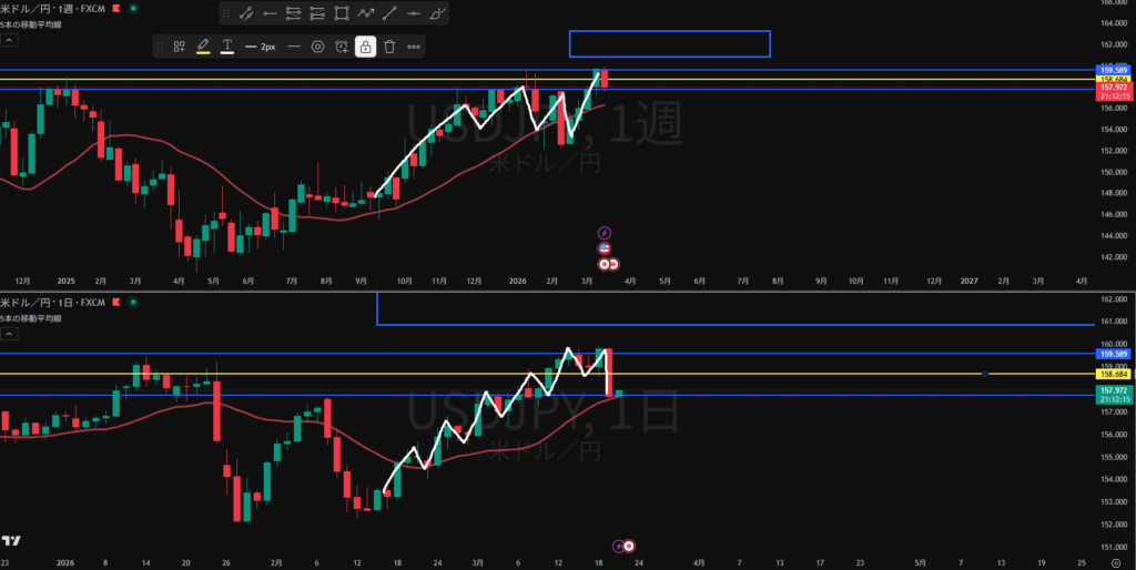 週足の戻り売り地点であるが、日足で上TTSの可能性もある