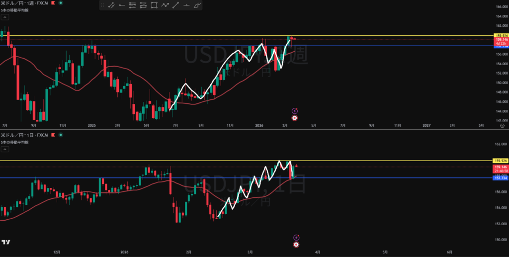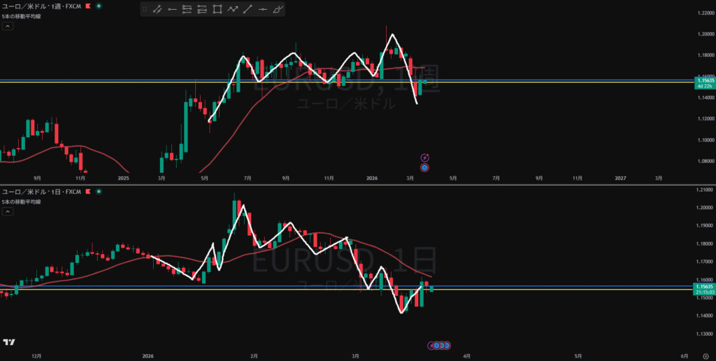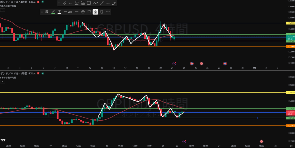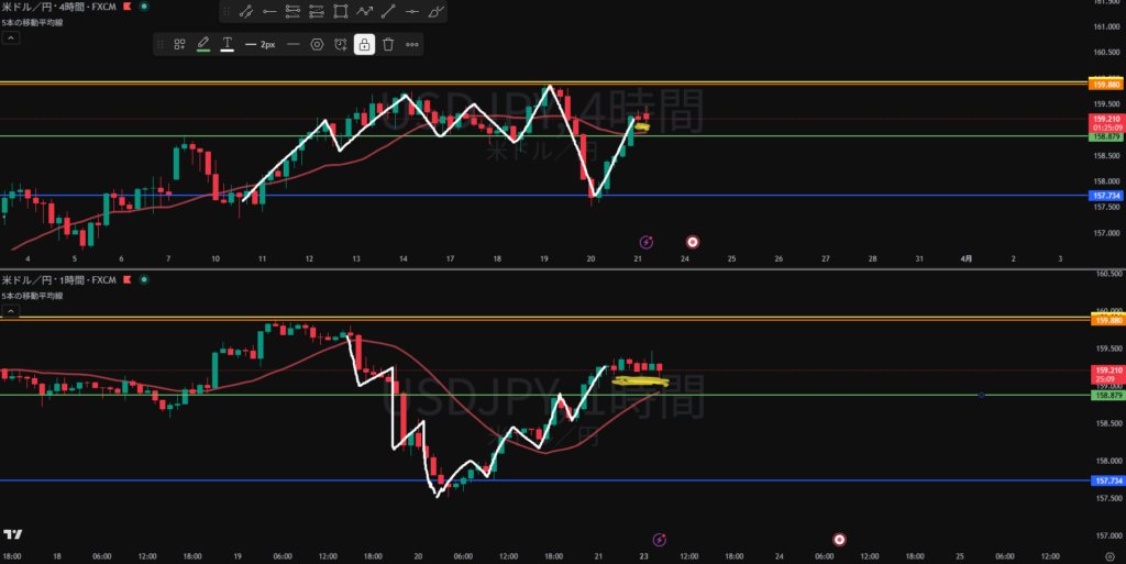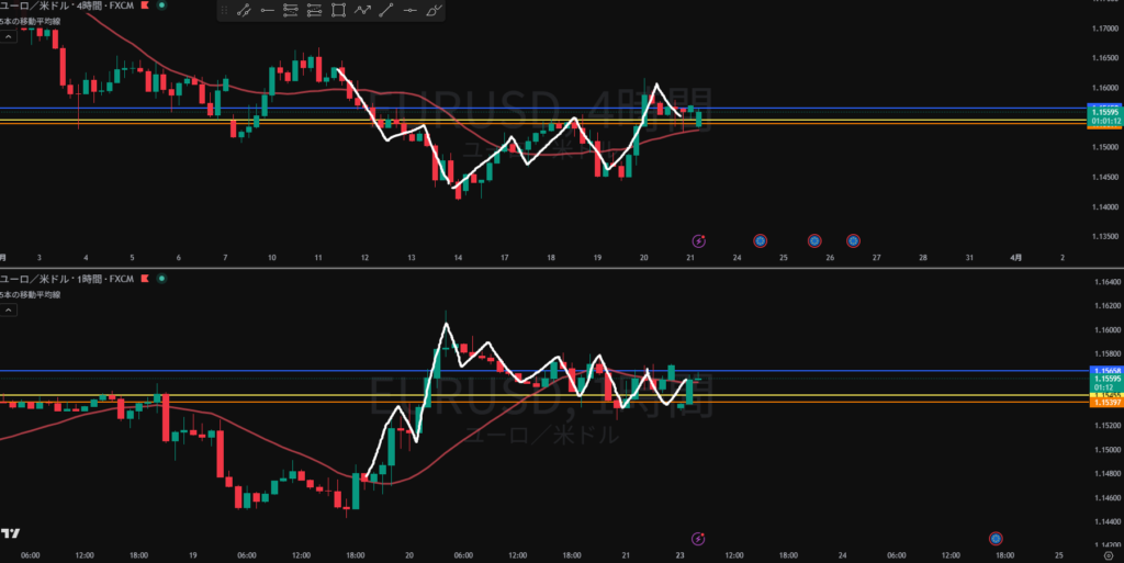 方向感なし 日足、週足の戻り売りと4Hの押し目買いが拮抗している?