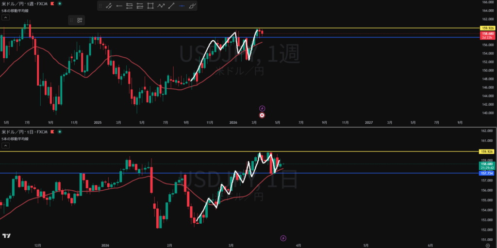 方向上 上昇の波の途中 前回高値更新を試そうとしている オレンジ線の下に押し目買い勢力