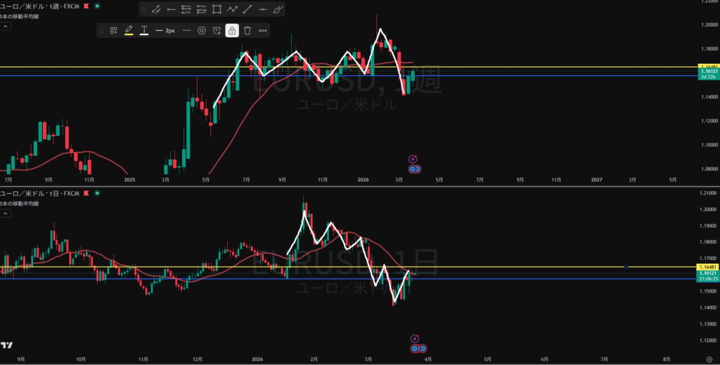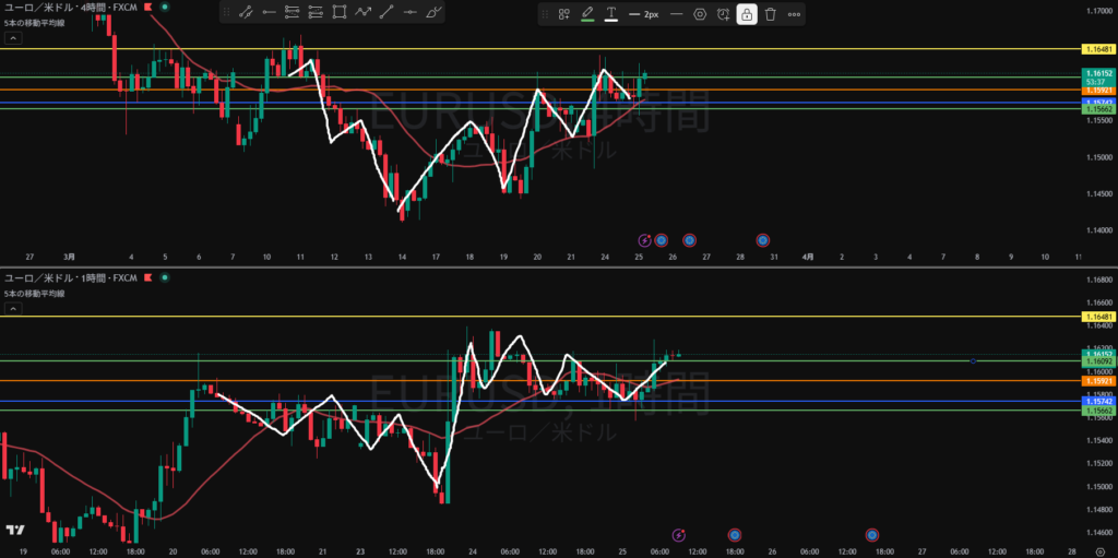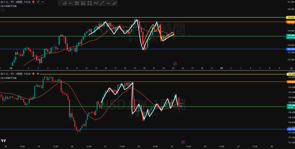 MA方向下減速 ロウソク足実体で交差 売り抑え買い支えどちらともいえない
