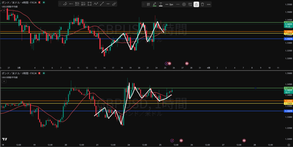 方向上 トレンド転換シグナル 上昇の波の途中 黄色線下押し目買い勢力