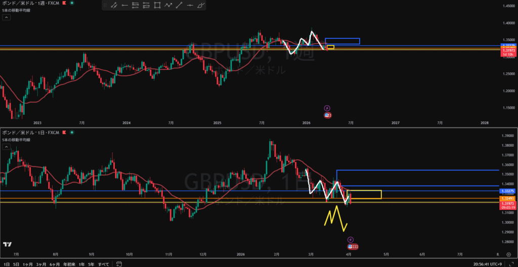 方向:下 トレンド継続から全戻し 黄色破線の上に売り抑え勢力