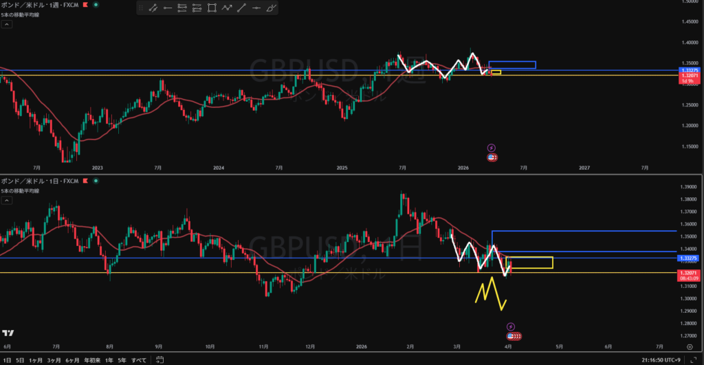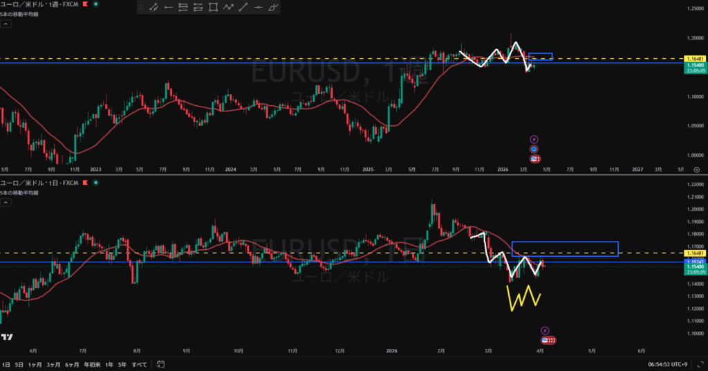 方向:下 トレンド継続から全戻し調整中 黄色破線の上に売り抑え勢力