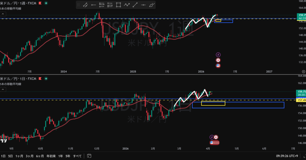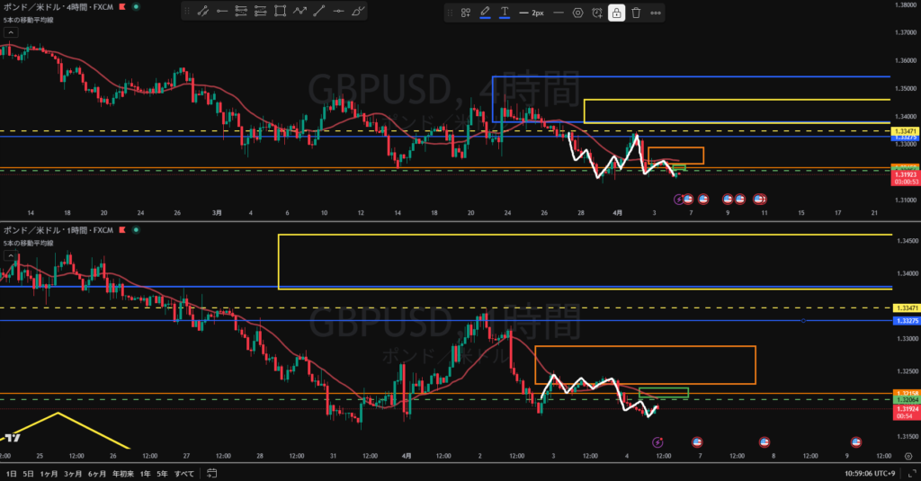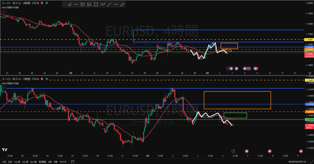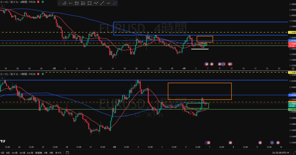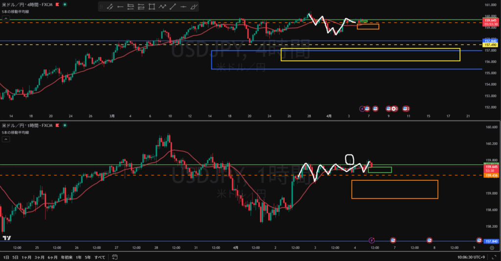 日足調整 4H方向感なし 4HのMA買い支えで右方上がりになりそう