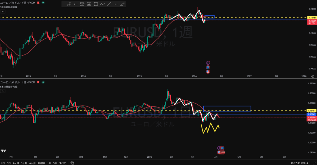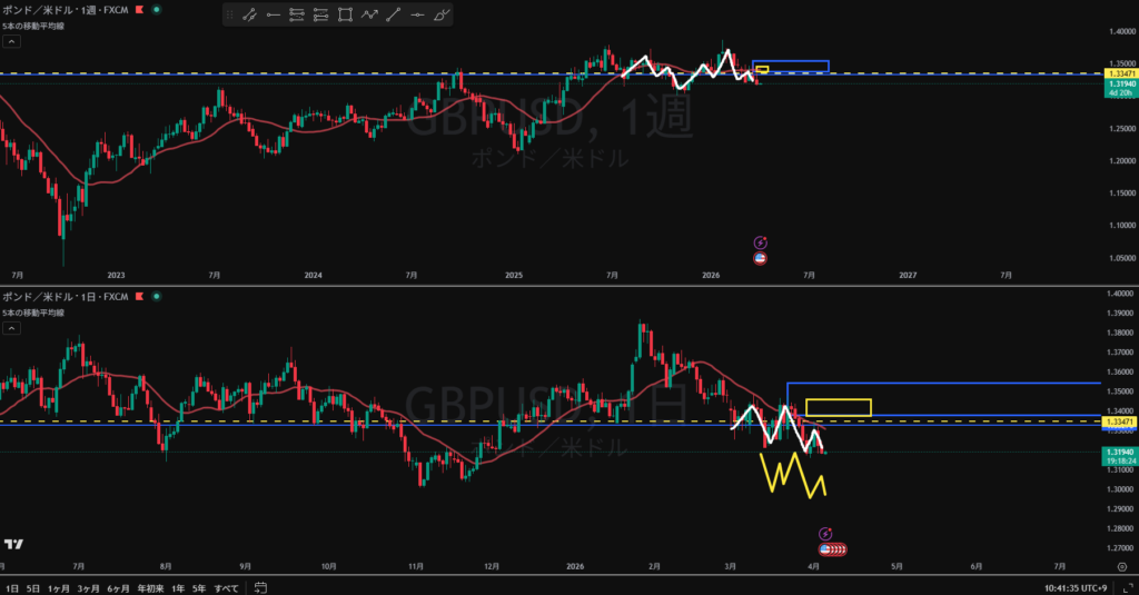 方向:下 トレンド継続から全戻し調整中 黄色破線の上に売り抑え勢力