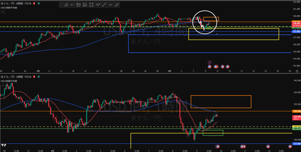 20:30現在、4Hオレンジ線付近 日足、4HMAで売り抑えられてる