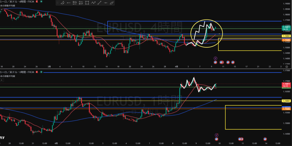 上の朝のシナリオは間違い! 日足上昇の波の途中だから4Hの押し目買いを狙っていく局面