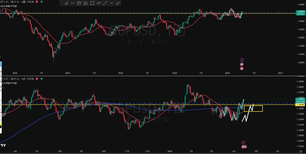 方向:上 上昇TTS 上昇の波の途中 黄色線下に押し目買い勢力 直上の週足売り圏内