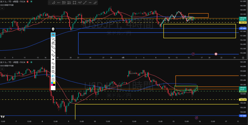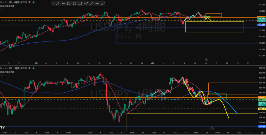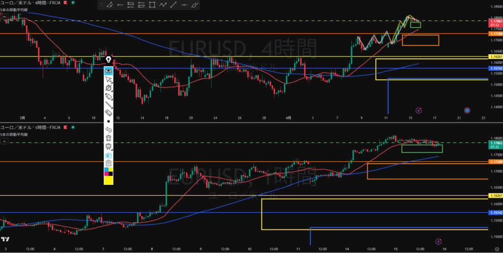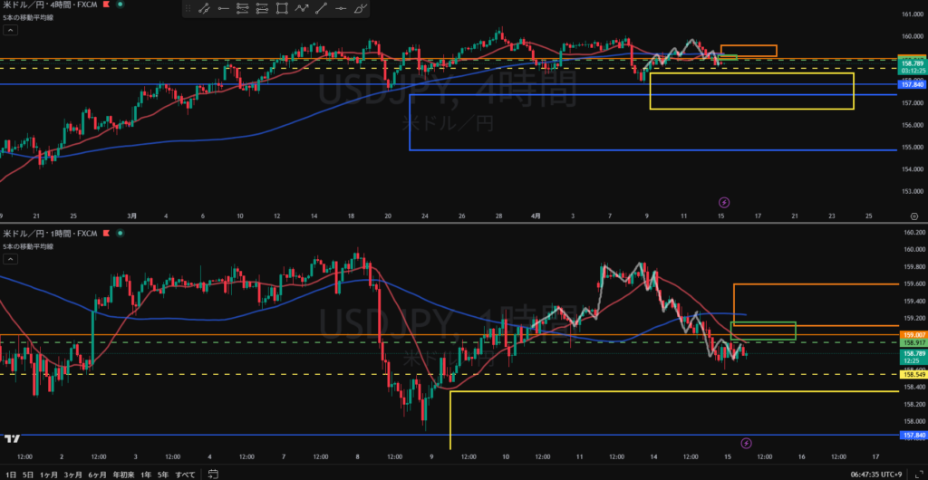 4H戻り売りで見たい 直下に日足か買い支えあるがエリアで考えればもう少し下か?