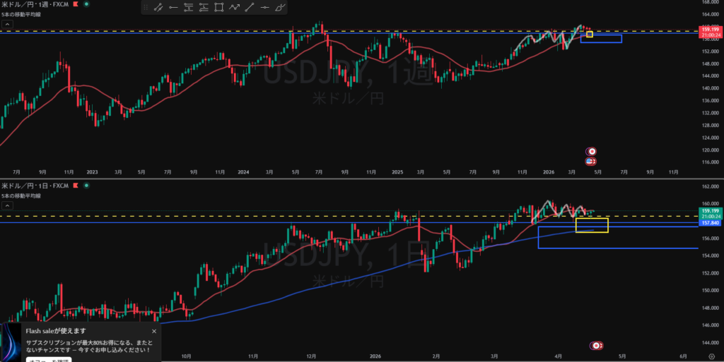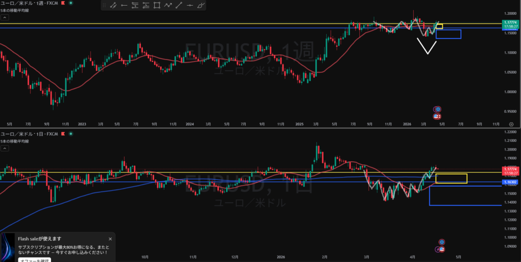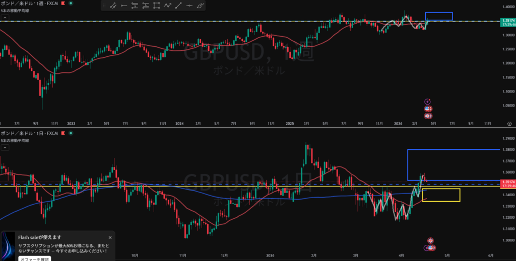 方向:上 押し目を付けてきている 黄色線下に押し目買い勢力