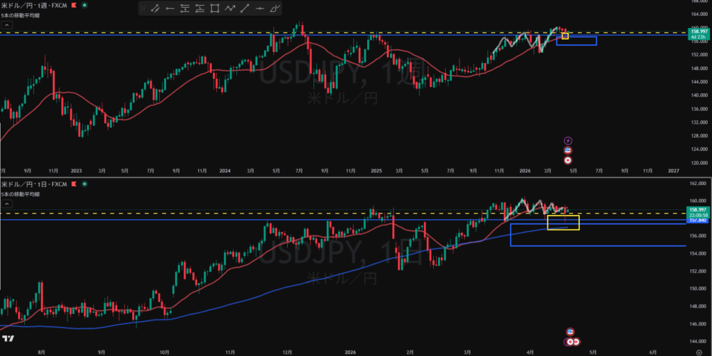 日足では黄色線で止められやすく、時間経過で押し目買いが入りやすい